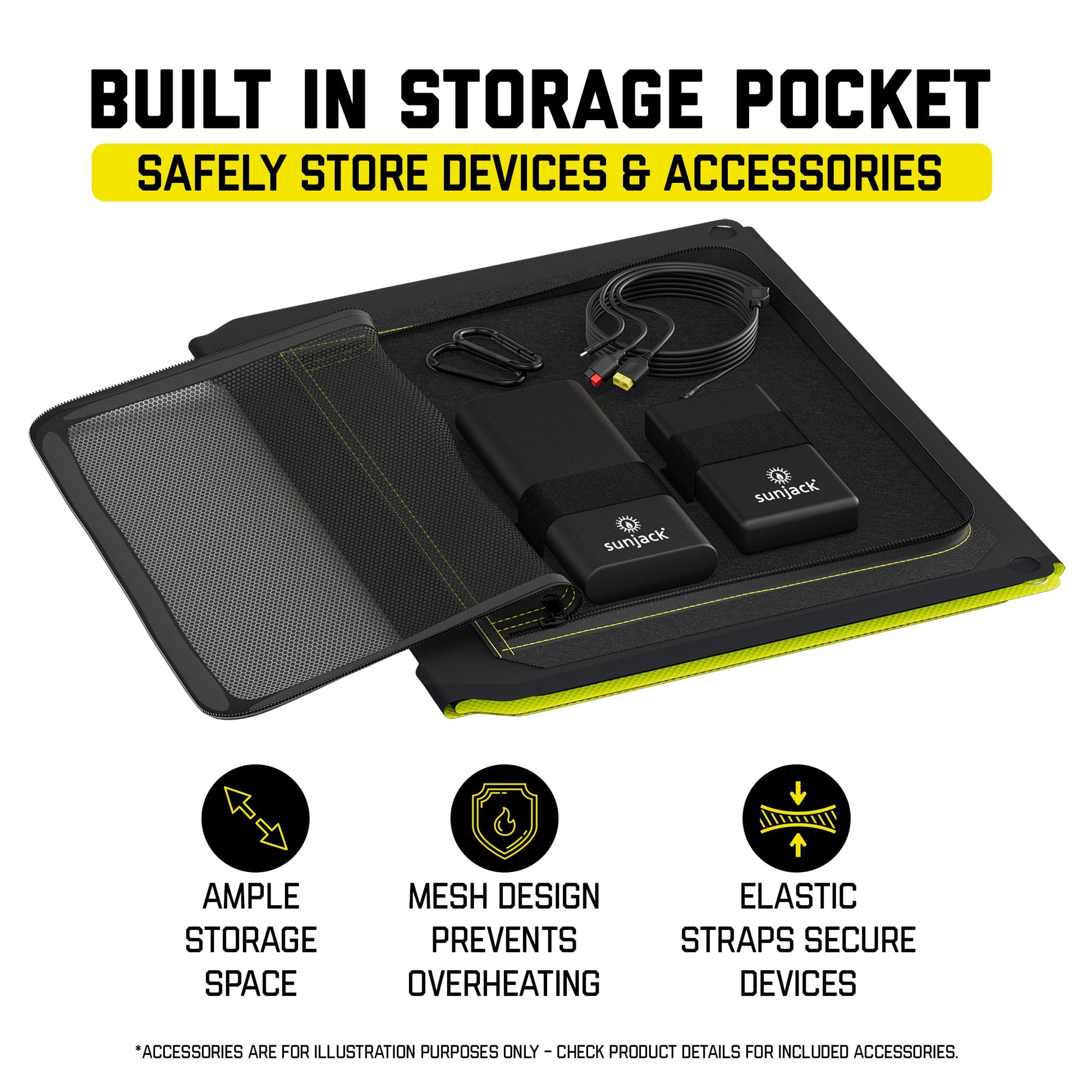 COMPACT & PORTABLE: Each solar panel is designed as a 4 panel system. The solar panels fold down to the size of a tablet and easily fit into most backpacks. The integrated pocket provides storage space for electronics and accessories and the mesh design intuitively allows airflow to prevent devices from overheating. The elastic straps secure phones, power banks and more during storage, travel and transportation.