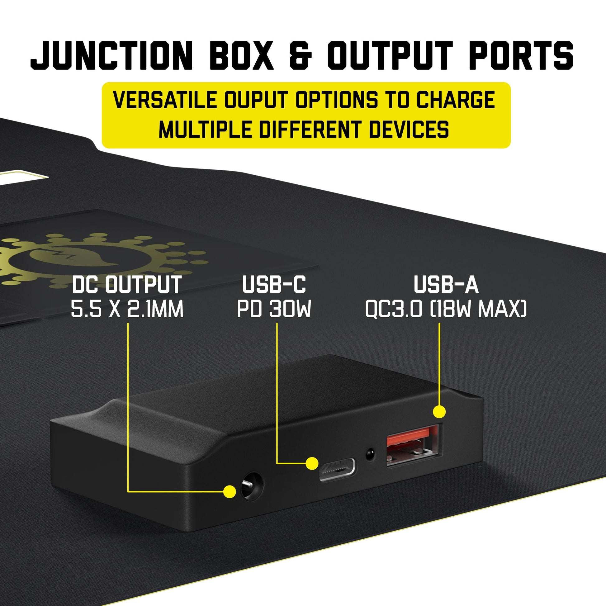 POWERFUL & FAST CHARGING SPEEDS: With up to 80 watts of power (40 watts for each solar panel), the monocrystalline panels sealed with ETFE provide maximum efficiency and UV-ray permeability. Each solar panel's 21V DC5521 port (25.1V open circuit voltage) provides enough charging power for most power stations while the dual USB ports can charge most USB-C (PD30W) and USB-A (18W max) devices. The ETFE construction is highly efficient, with a UV permeability of 95% compared to 80% from standard PET construction.