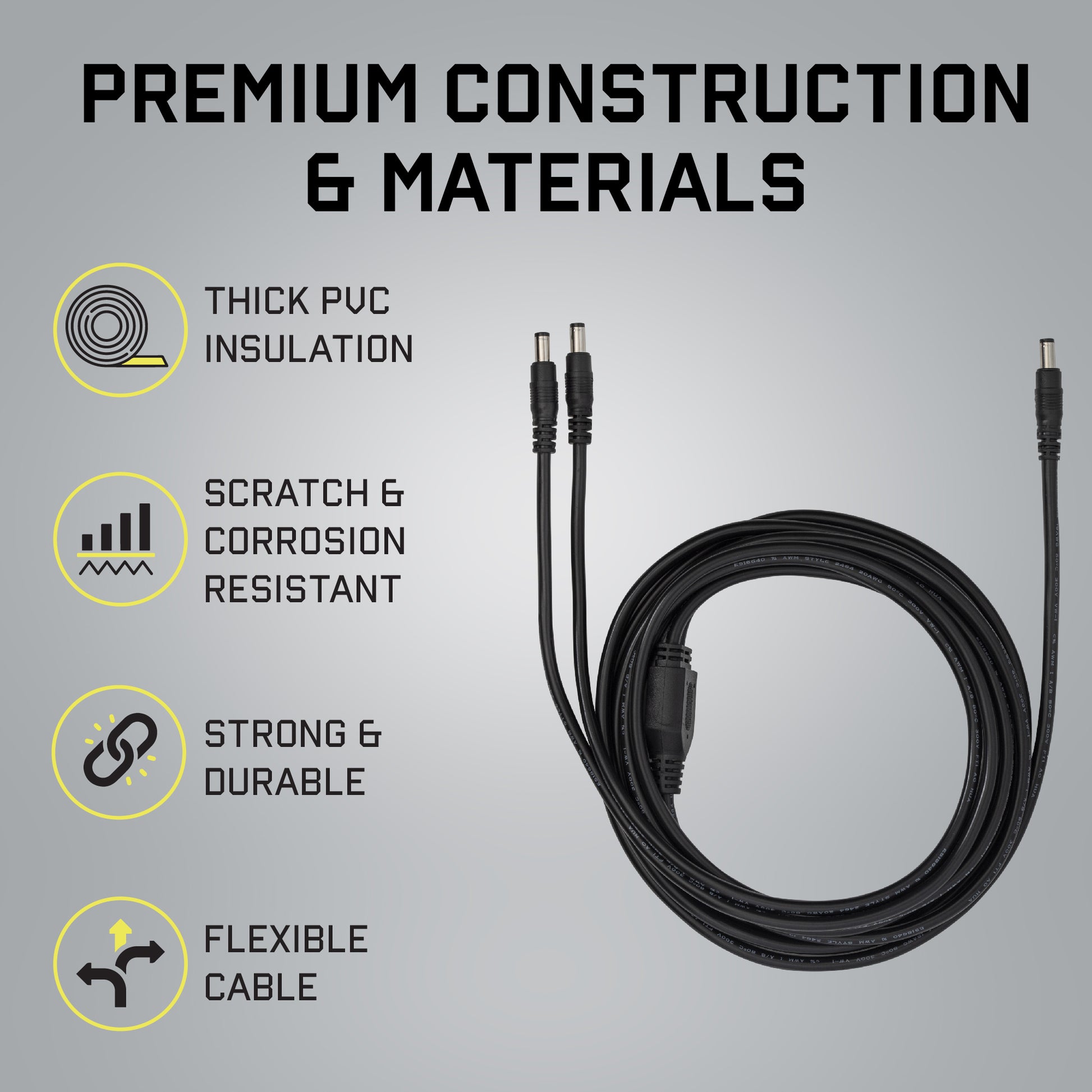 PARALLEL ADAPTER CABLE: Made from premium materials, safe to use and very durable. Outer PVC insulation is thick, scratch and corrosion resistant, and flexible. Max voltage is 300V. The main cable gauge is 18AWG and can carry a max 8A current. Each branch cable is 20AWG and can carry a max 5A current. Total cable length is 10ft – main cable is 7ft long and each branch cable is 3ft long. The extended length lets you easily connect two solar panels to a power source. Cable can be used in a variety of setting and with all low voltage DC powered devices that are compatible with DC 5.5mm x 2.1mm, such as CCTV Security Cameras, LED Lights and more.
